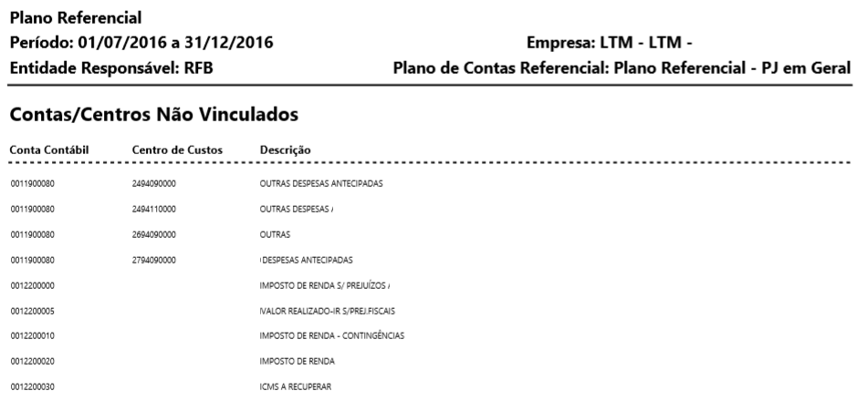 Na segunda parte do relatório serão demonstradas as contas/centros que possuem movimentação no período informado e não estão associadas no plano referencial: