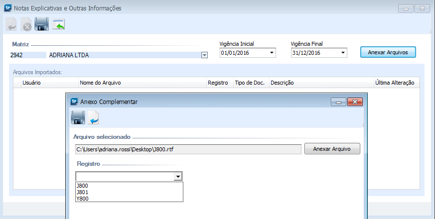 A partir do ano calendário 2016, após clicar em “Anexar Arquivos” será aberta a tela “Anexo Complementar” para informar em qual registro deseja anexar o arquivo.rtf