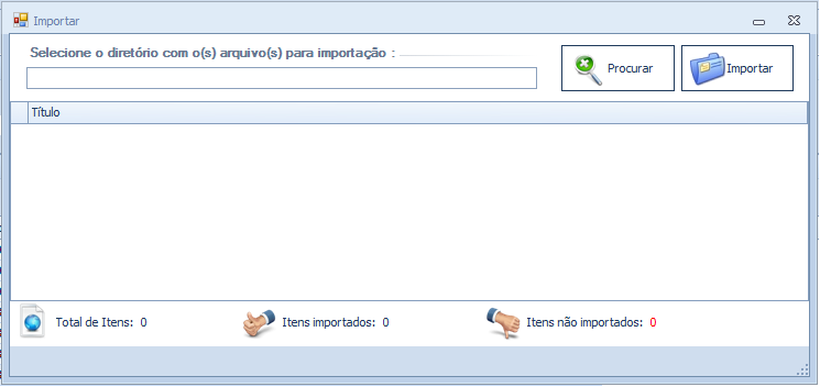 Uma nova tela será aberta. Selecione o diretório no qual estará o arquivo texto a ser importado, clicando em Procurar. Ao encontrar o arquivo, clique em Importar.