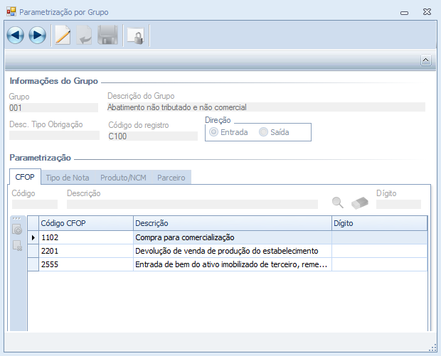 Descrição da Nota: Desenvolvimento da funcionalidade Parametrização por Grupo na qual serão parametrizados os CFOPs, Tipo de Nota Fiscal, Produtos, Grupos de Produtos, NCMs e Parceiros em seu respectivo Grupos, de acordo com a operação fiscal (entrada ou saída) e código do registro.