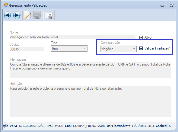 É importante salientar que as validações que estiverem habilitadas na tela Gerenciamento Validações do Comply/SPED, que são do tipo Erro, configuradas como Negócio, que estão ativas e com a opção de Validar Interface? marcada, continuarão a serem validadas normalmente.