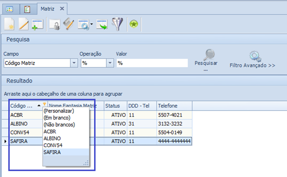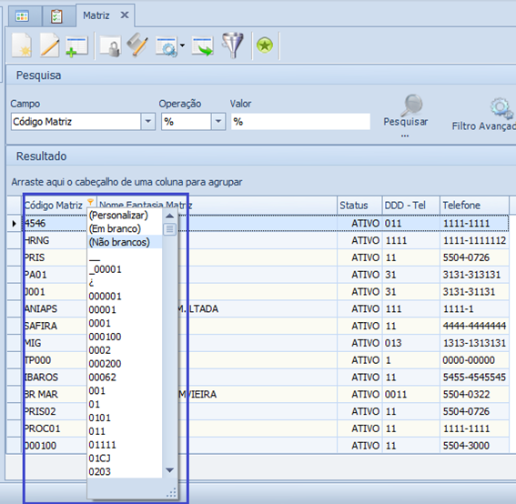 Exemplo de uma das telas mencionadas acima, estava sendo apresentada todas as Matrizes, mesmo que não estivesse configurado.