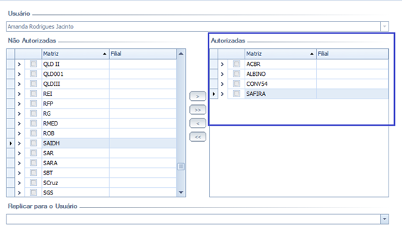 Exemplo de duas telas mencionadas acima, habilitando somente as matrizes que foram configuradas no perfil.