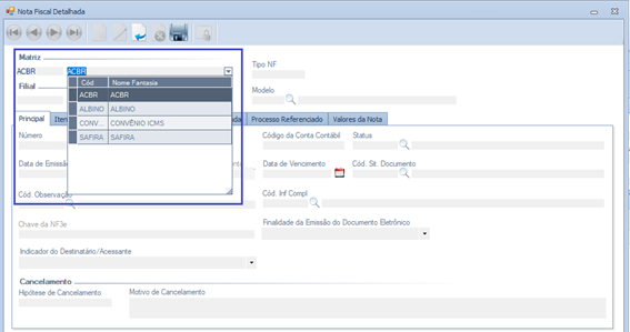 Tratamento para exibir os dados de Matriz e Filial nas telas: ‘Matriz’, ‘Filial’ e ‘Nota Fiscal Detalhada’, permitindo acesso as Matrizes e Filiais conforme configuração na tela Associar Usuário x Filial.