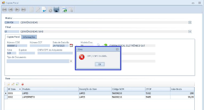 Descrição da Nota: Tratamento realizado na tela de Cupom Fiscal para que não seja apresentado erro quando o campo CPF/CNPJ do Adquirente estiver com um espaço.