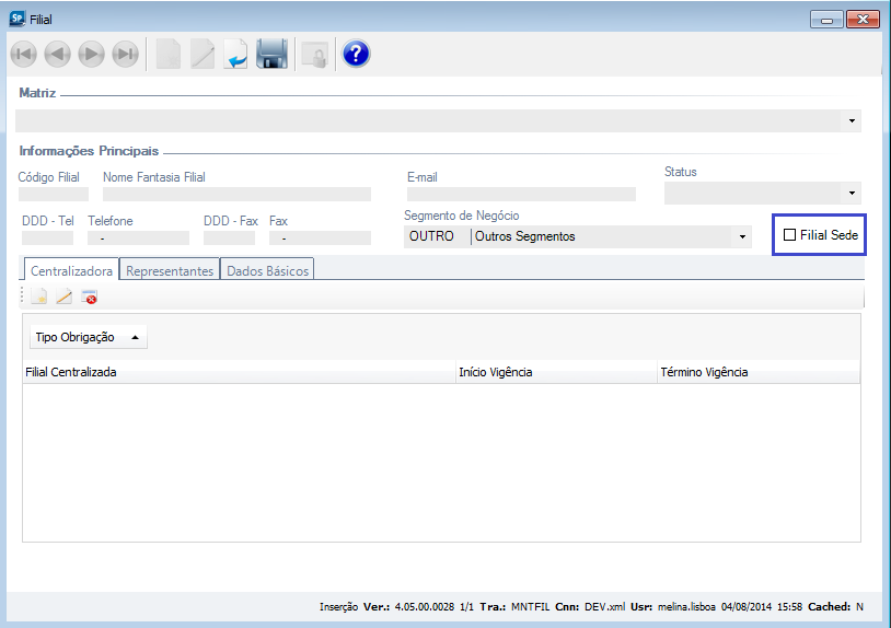 Descrição da Nota: Inserção do campo Filial Sede na tela de Filiais.