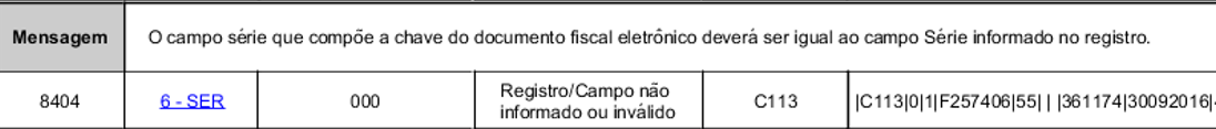 Para as Notas Fiscais Eletrônicas sem série, o campo 06 (SER) do registro C113 não era apresentado, ocasionando o seguinte erro no validador: