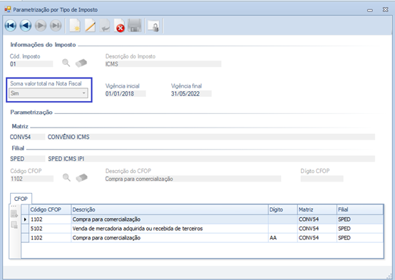 O imposto ICMS será somado ao total da Nota Fiscal para os CFOPs 1102, 1102 AA e 5102 conforme a vigência parametrizada, 01/01/2018 até 31/05/2022.
