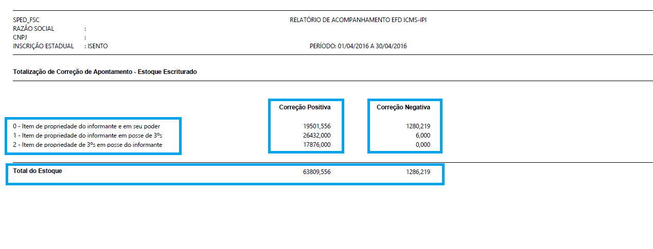 No final do Relatório de Acompanhamento EFD ICMS-IPI da Correção de Apontamento – Estoque Escriturado, exibirá a Totalização das Correções por Tipo de Estoque para uma melhor análise Total do Estoque.