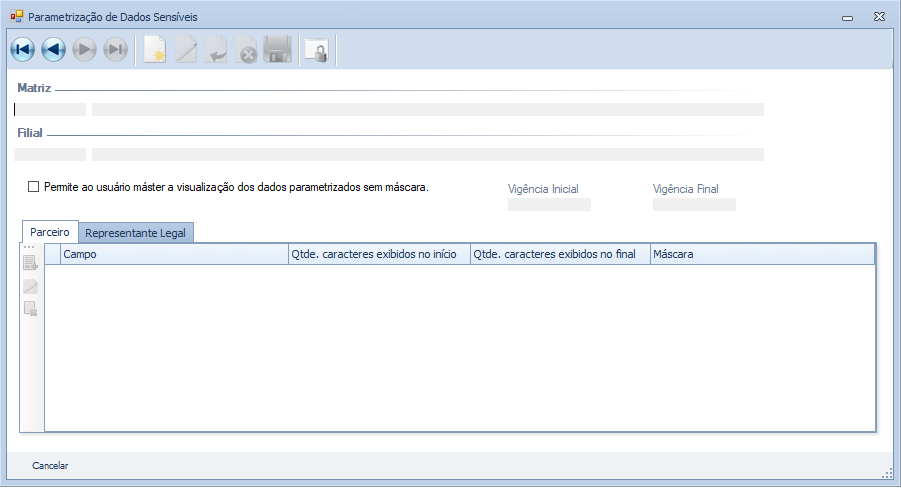 Esta tela tem a finalidade de parametrizar os dados sensíveis e as máscaras que serão visualizados nas telas: "Parceiro" e "Representante Legal" pelos usuários.