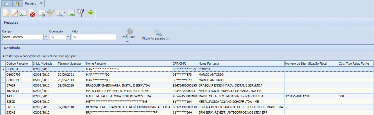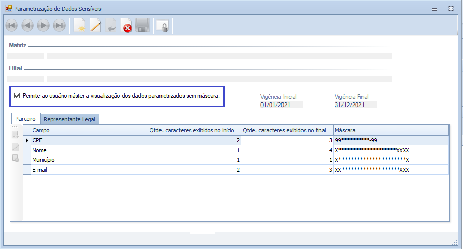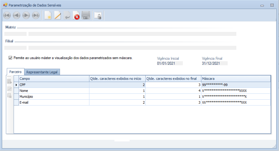 Os dados sensíveis parametrizados, serão visualizados nas telas "Parceiro" e "Representante legal", conforme período e definição das máscaras.
