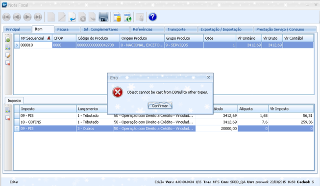 Problema ao inserir dados em impostos através da tela principal de Nota Fiscal.