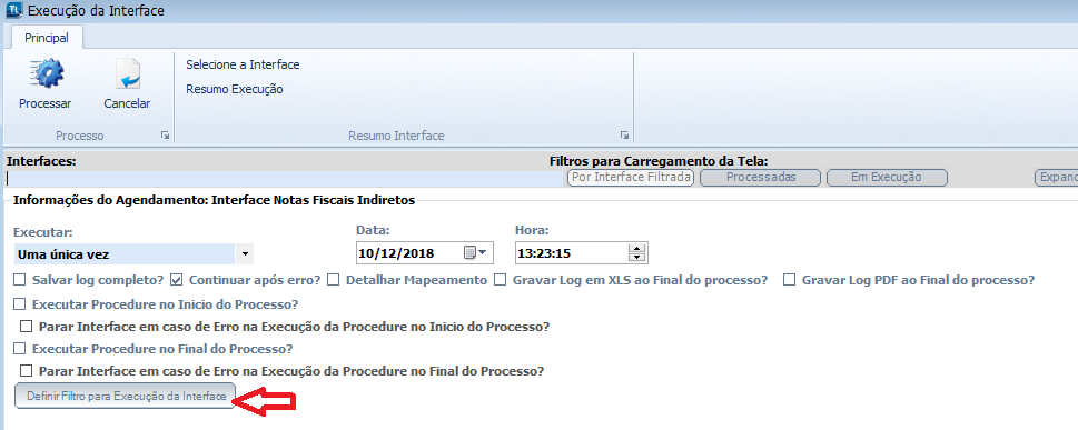 Dentre os controle relacionados ao processo está disponível um botão que permitirá definir filtro, para a Execução da Interface, onde apenas serão processados registros que atenderem aos condição definidas.