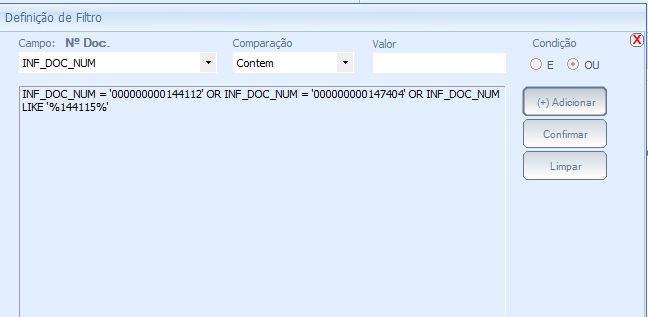 Para incluir filtros, selecione o campo desejado, selecione o tipo de Comparação, preencha o Valor, e marque a Condição (esta opção deve ser marca independentemente de haverem outros filtros a serem incluídos, é marcada uma única vez e não pode ser alterada) e clicar no Botão “(+) Adicionar”. Após adicionar todos os filtro basta clicar no botão “Confirmar” para voltar ao controles do Processo. Se forem adicionados parâmetros os mesmo iram ser apresentados log abaixo ao botão responsável pela definição dos filtros.