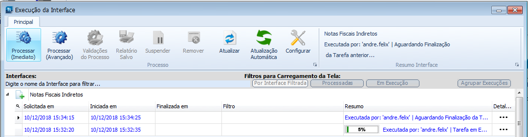 Foi ajustado e tela de Execução de Interfaces para permitir a criação de mais de uma tarefa para a mesma interface, o processo de Interface foi ajustado o processo para que ao identificar que uma interface já está sendo executada. Ao invés de ser encerrada a tarefa com erro, a(s) nova(s) nova(s) tarefas iram aguardar até a finalização da anterior para seguirem no processamento das mesmas.
