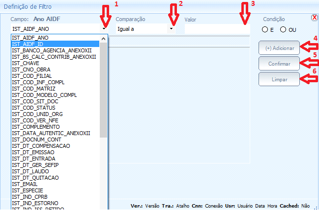 Será carregada tela contendo os campos da tabela principal da interface selecionada para preenchimento dos filtros, selecione o campo (1), a condição de comparação (2), preencha o valor a ser comparado (3) e Clique no botão “Adicionar” (4), para incluir a informação a ser filtrada, Clique no botão “Confirmar” (5) para iniciar o processo, ou Caso queira limpar todas as informações do filtro clique no botão “Limpar” (6).