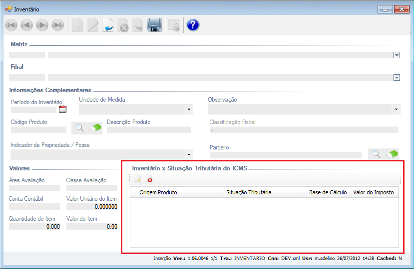 Alteração na tela de Inventário para parametrização de Inventário por Código de Situação Tributária do ICMS: