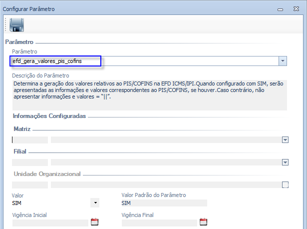 Disponibilização do parâmetro "efd_gera_valores_pis_cofins" na tela "Configurar Parâmetro", conforme demonstrado abaixo: