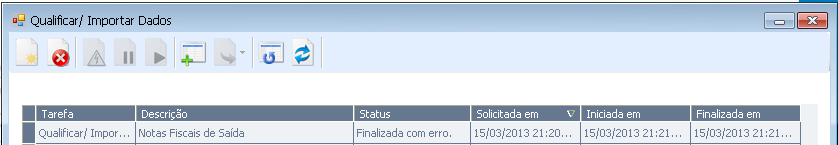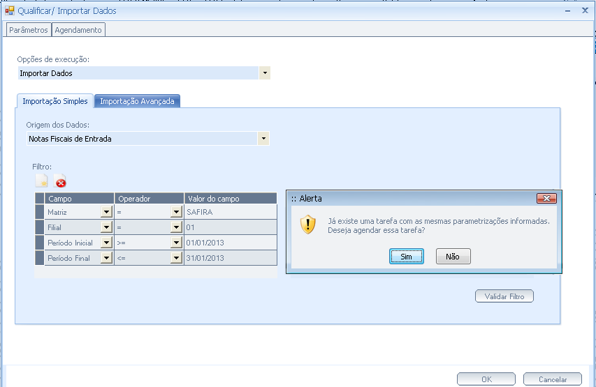 “Já existe uma tarefa em execução com a Matriz SAFIRA, Filial 01, Período Inicial 1/1/2013 e o Período Final 31/1/2013. A tarefa foi cancelada.”.