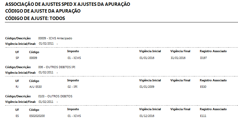 Nesta opção serão listados os Ajustes da Apuração, Descrição e Vigências e abaixo dele todos os Ajustes do SPED que foram associados pela tela Associação dos Ajustes, com as informações: UF, Código SPED, Imposto, Vigências e Registro Associado.
