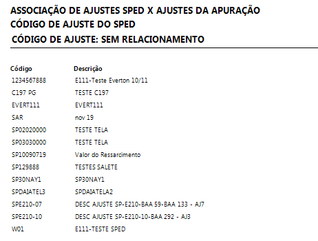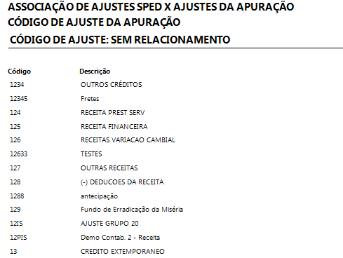 Para melhor controle de todos os códigos existentes e os que não foram relacionados na tela Associação de Ajustes, ao final do relatório são demontrados os Códigos sem Relacionamento, tanto na Opção Ajuste do SPED como na Opção Ajuste da Apuração.