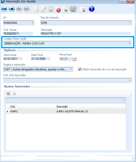 Tratamento realizado na tela 'Associação dos Ajustes' para atendimento da Instrução Normativa nº 05/2017_Sefaz/RO.