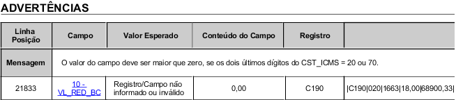 Nos lançamentos com redução da base de cálculo de ICMS, em que o mesmo item da Nota Fiscal possui CST diferente, o registro C190 não era demonstrado para todas as combinações CST_ICMS, CFOP e ALIQ_ICMS existentes. Consequentemente, não era apresentado no campo "10 - VL_RED_BC" deste registro, o valor referente à base não tributada e o PVA exibia a seguinte mensagem de advertência: