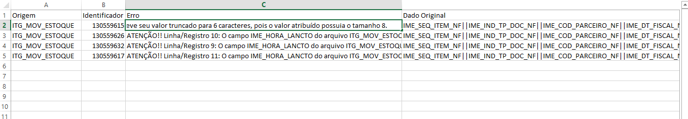 ATENÇÃO!! Linha/Registro 10: O campo IME_HORA_LANCTO do arquivo ITG_MOV_ESTOQUE teve seu valor truncado para 6 caracteres, pois o valor atribuído possuía o tamanho 8.