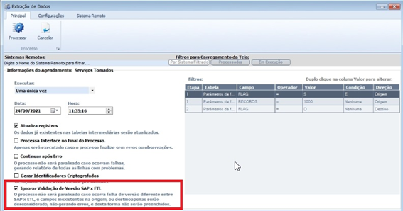 Implementação de funcionalidade para compatibilização do parâmetro Ignorar Versão SAP X ETL, na execução do processo de Extração de Dados para execuções através do Sonda Connector.