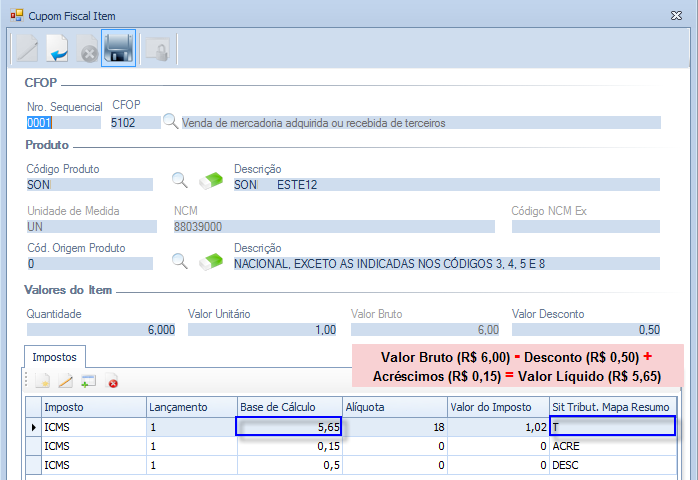 Assim, será demonstrado o valor da base de cálculo dos impostos 01, 03, 09 ou 10, quando a Situação Tributária do Mapa Resumo for tributada (T), visto que, corresponde ao valor líquido do item.