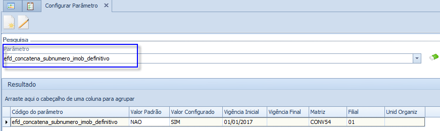O parâmetro “efd_concatena_subnumero_imob_definitivo” foi disponibilizado na tela "Configurar Parâmetros", conforme ilustrado abaixo: