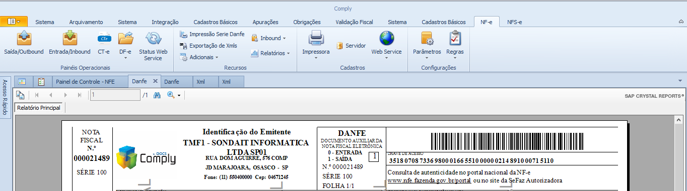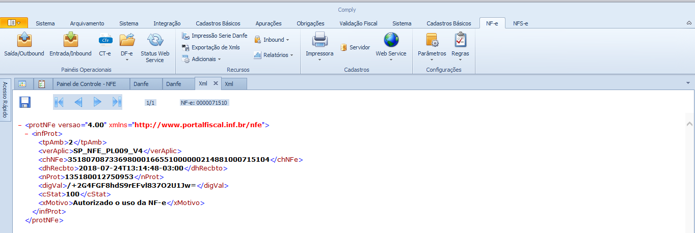 - Framework - Tela – Melhoria na visualização do Danfe e XML. Melhoria nos processos ‘Visualizar DANFE’ e ‘Visualizar Xmls’ para que seja possível abrir vários Danfe’s e Xml’s pelo Comply, estes serão abertos em novas abas e será possível “navegar” entre elas: