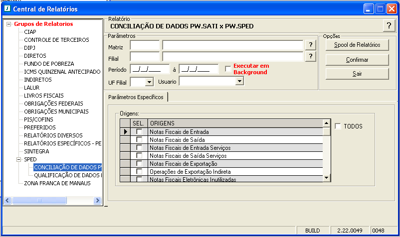 Inclusão das origens abaixo no relatório CONCILIAÇÃO DE DADOS PW.SATI x PW.SPED: