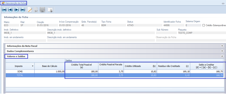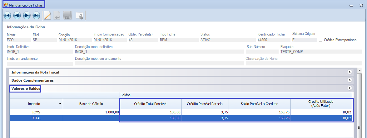 Efetuada melhoria na aba “Valores e Saldos”, da tela de Manutenção de Fichas, para melhoria na visualização e conferência de valores.