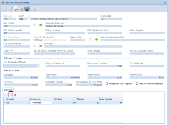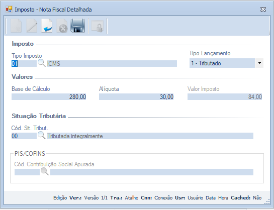Após selecionar a opção de edição em ‘Item – Nota Detalhada’, será apresentada a tela ‘Imposto – Nota Detalhada’, conforme apresentado abaixo: