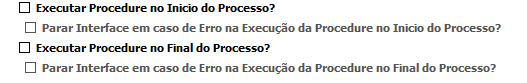 - Através do botão Processar (Avançado) a opção de executar procedures, antes ou no final do processo. Será possível selecionar procedures do banco para que sejam acionadas pelo processo de interface, passando ou não parâmetros para a mesma, e ainda definir se a interface deverá ou não prosseguir a execução em caso de falha da execução da procedure.