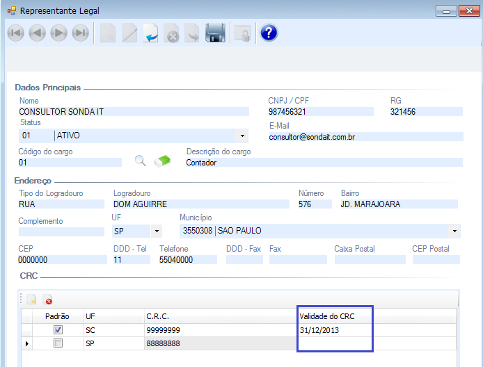 Descrição da Nota: Criação do campo Validade do CRC na tela Representante Legal para atendimento as exigências do novo layout do SPED Contábil.