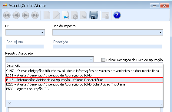 Para apresentar essa informação no registro E115, foi disponibilizada a opção "E115 - Informações Adicionais da Apuração - Valores Declaratórios" no campo “Registro Associado” da tela de “Associação dos Ajustes”.