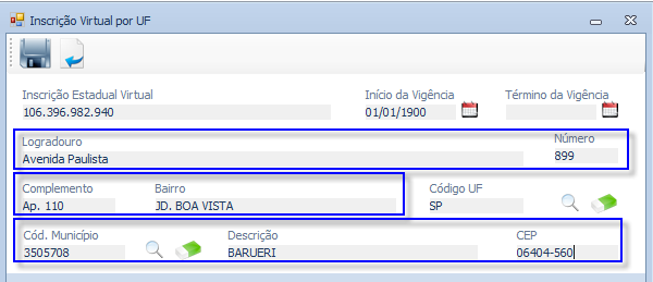 Disponibilizados os campos: Logradouro, Número, Complemento, Bairro, Município e CEP na tela Inscrição Estadual Virtual, conforme ilustrado abaixo: