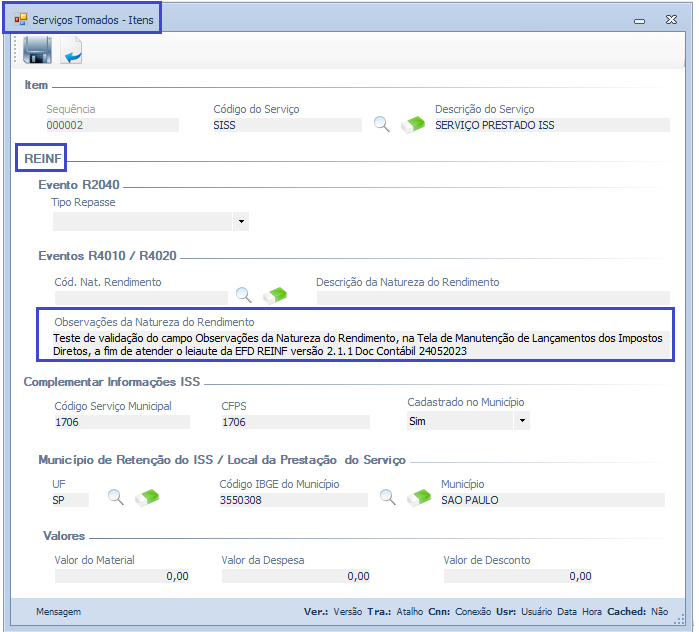 Melhorias na tela Serviços Tomados, aba Itens e na tabela "STD_SERVICO_TOMADO_ITEM", com a inclusão do campo Observações da Natureza do Rendimento (SIT_OBSERV_NAT_REND), em atendimento a versão 2.1.1 do EFD-Reinf.
