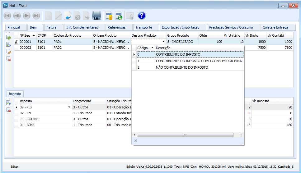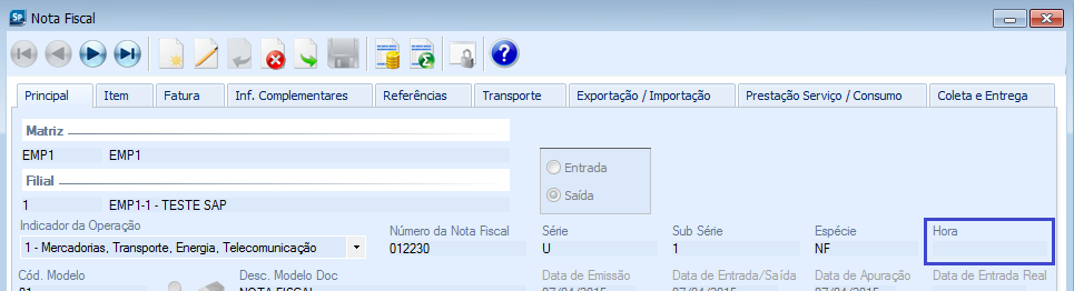 Descrição da Nota: Criação da Tabela C - Destinatário da Mercadoria, Bem ou Serviço em atendimento ao Ajuste Sinief nº 5 10/2015 e inclusão do campo na tela de Item. Inclusão do campo Código Lista na tabela e tela de Medicamentos por Item. Inclusão do campo Hora na tela de Notas Fiscais.