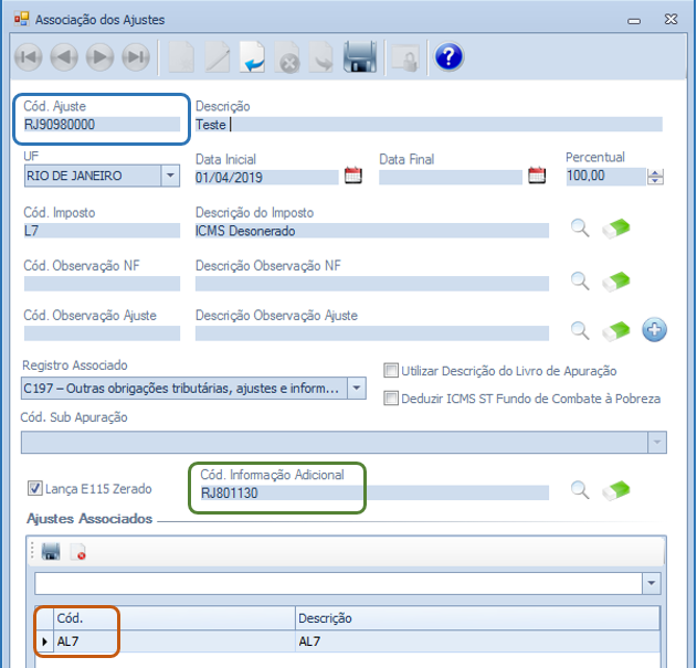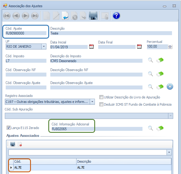 Descrição da Nota: Tratamento na tela Associação dos Ajustes, que reflete na geração dos registros C197, D197 e E115, conforme determinado na Portaria SUCIEF 55 de 19/02/2019 do Rio de Janeiro. Foi desenvolvida a possibilidade de realizar cadastros para iguais Códigos de Ajuste, diferentes Cód. Informação Adicional e diferentes Cód. Ajustes da Apuração associados.
