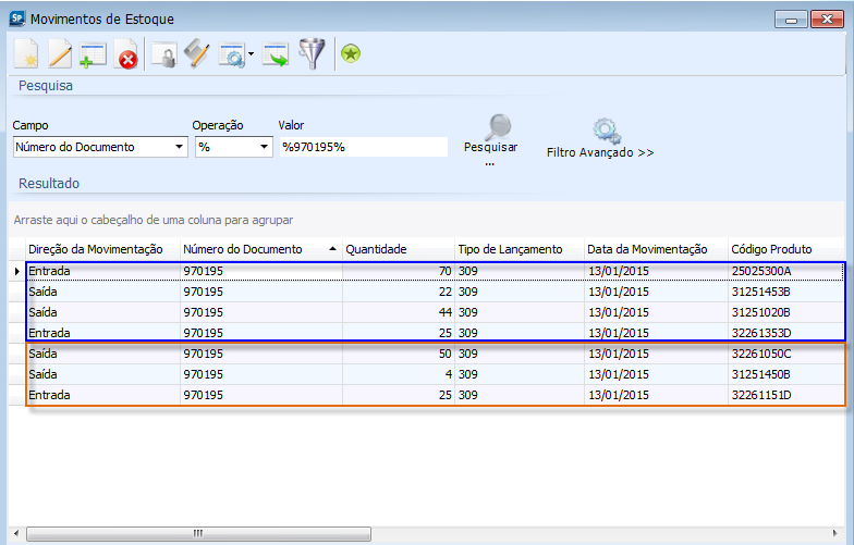 Para o cenário em que diversos códigos de origem (Direção do Movimento: Saída) e de destino (Direção do Movimento: Entrada) estão atrelados ao mesmo número de documento, o registro K220 era gerado incorretamente porque não era possível relacionar as origens com os respectivos destinos, conforme demonstrado abaixo: