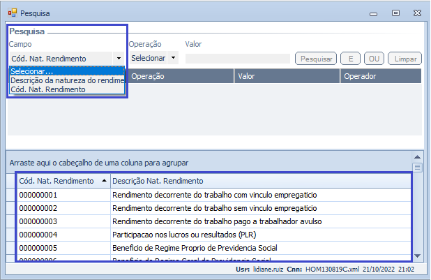 Ao clicar no botão de pesquisa do campo Cód. Nat. Rendimento, serão demonstrados os códigos da natureza dos rendimentos e suas descrições.