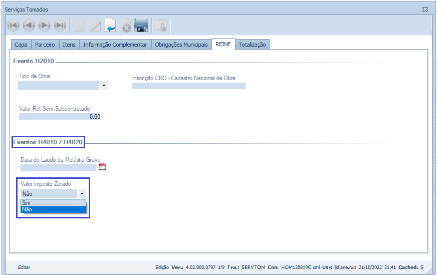 Na aba REINF, em Eventos R4010 / R4020, foi incluído o campo Valor Imposto Zerado, com as opções de preeenchimento Não (default) e Sim.