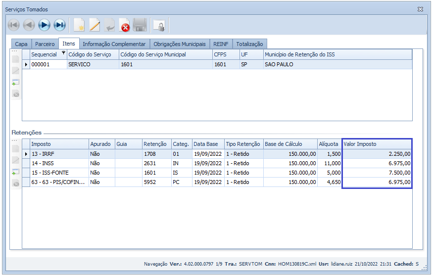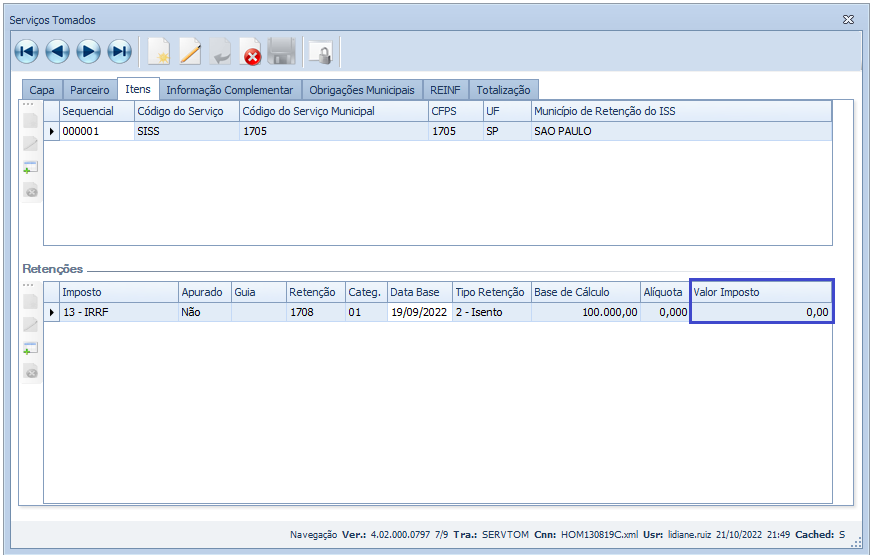 Na aba Itens, o campo Valor Imposto não está zerado.