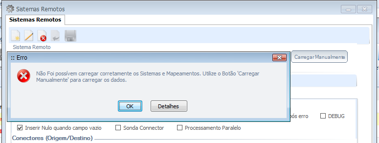 - Melhoria para carregamento das informações, caso ocorram erros na recuperação das Informações relativas ao Mapeamentos, Sistemas Remotos ou aos Parametrizações relacionadas, será exibido um botão que permitirá executar um novo carregamento dos dados na tela.