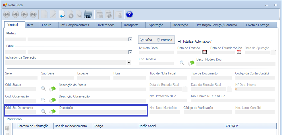 4º - Inclusão do campo Cód. Sit. Documento na tela de Nota Fiscal Detalhada.