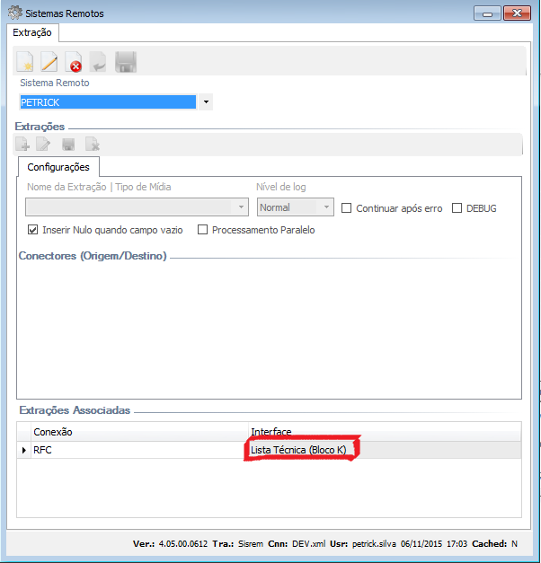 * - Bloco K => Essa extração do tipo Conector RFC - SAP, foi segregada e substituida pelas novas extrações denominadas por: Movimento de Estoque (Bloco K), Lista Técnica (Bloco K) e Ordem de Produção (Bloco K).