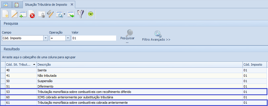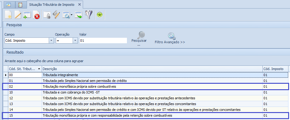Foi realizada alteração na tela Situação Tributária de Imposto para inclusão dos novos CSTs para o imposto (01) ICMS.